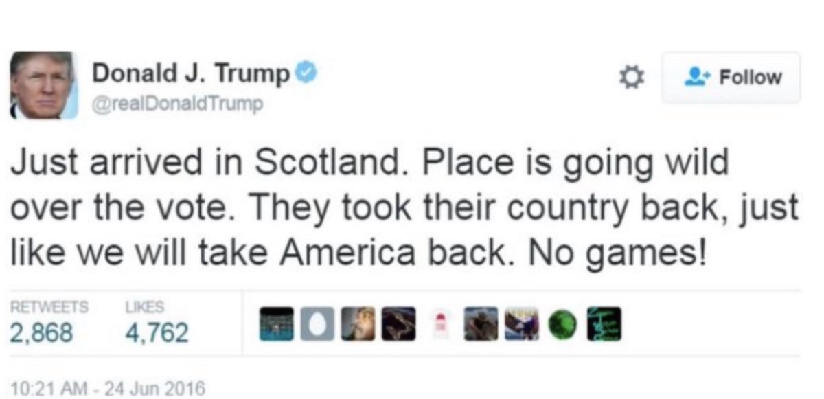 Alright, one thing. You forced me into this. The leader claims he predicted that the English would vote in favor of “Brexit” the day before the voting took place. He said that he was at a reopening of his golf club on the day before the vote and predicted the outcome. That would have been June 22, 2016. The vote took place on June 23, 2016. As usual he considers himself the smartest man in the room, in the British Isles this time. Except…Wait, you what’s coming don’t you? HIS OWN TWEETS HAVE HIM SHOWING UP IN SCOTLAND ON JUNE 24, 2016!.